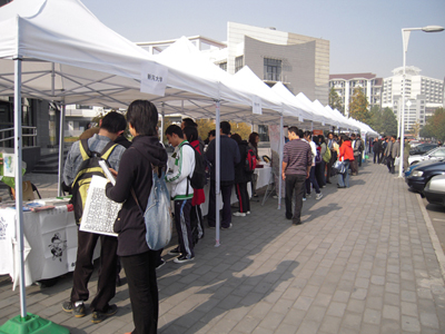 北京大学ではまず在中国日本国大使館の横井理夫一等書記官による日本留学に関する説明がありました。その後、学生たちは各自興味のある大学のブースへと足を運び積極的に質問をしていました。清華大学では清華大学学生国際文化節の一環として行われました。野外テントに各大学が資料を並べ、学生たちへ各自の特色をアピールしていました。北京大学では約200人、清華大学では約300人の学生が参加し、充実した説明会となりました。