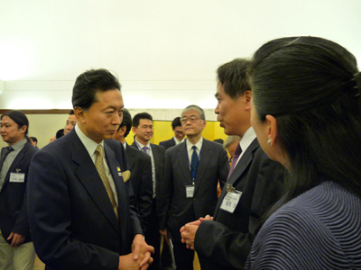 この会議に先立って、前日の9日夕方、在中国日本国大使館公邸で、「鳩山由紀夫総理との懇談会」が開催されました。懇談会には中国で活躍している日本人の中から、企業関係者、学術·研究所関係者、文化関係者、日本人留学生、青年海外協力隊員、日本人学校関係者、日本人会関係者など約100名が招待されました。