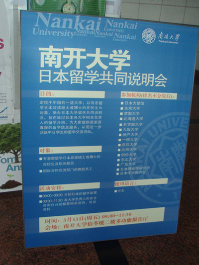 日本の大学への留学を目的とする留学説明会が2009年3月12日に天津大学にて、3月13日に南開大学にて行われました。