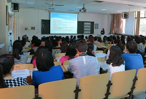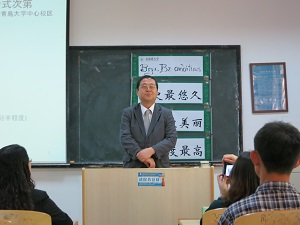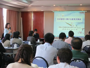 また、当日の午前には青島大学内で、青島市内の大学の日本語学科担当教員と日本の大学担当者との意見交換会が行われました。中国側からは青島大学の王 念家博士が「日本留学に関する中国人学生の抱えている問題について」と題し、青島大学で日本語を学ぶ学部学生に行ったアンケート調査に基づいた日本留学に対する諸問題について、日本側からは北海道大学北京オフィス所長の野澤俊敬教授が、日本への留学を考える中国人学生の意識調査について発表しました。引き続き行われた質疑応答では、日本の留学制度や入試制度などについて具体的な質問がかわされ、予定時間を延長しての活発な意見交換の場となりました。