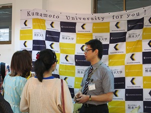 全体説明会では、はじめに在青島日本国総領事館の平木場弘人総領事が、「留学は、みなさん個人にとっても、また、国と国との相互理解のためにも重要な機会です。今日は多くの大学の担当者が来ていますので、疑問点などなんでも質問してください」と中国語で挨拶しました。青島大学日本語学科の張主任、北海道大学北京オフィス所長の野澤俊敬教授の挨拶に続き、在中国日本大使館の李 賛東留学アドバイザーが日本の留学制度について詳しく説明しました。その後、日本から参加した大学担当者が、書道やポスター、大学のキャラクターを使った趣向をこらしたプレゼンテーションを行い、各大学の魅力と特徴をアピールしました。会場は立ち見が出るほどの盛況で、資料参加大学のパンフレットもすぐに底をつき、関心の高さがうかがえました。
