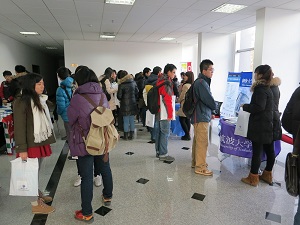 その後、中国に事務所を構える日本の大学9校が参加して大学説明会を行いました。会場には個別にブースを設置し、多くの学生でにぎわいました。