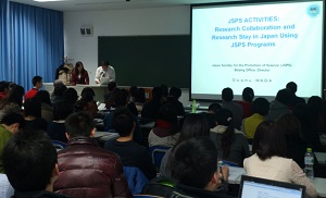 このような説明会は北京市内の大学を中心に、昨年から継続して開催しています。日本国大使館、JST、JSPSと各大学が連携した説明会を開催することで、学生にとっては一度に様々な情報を得ることができ、非常に好評を得ています。