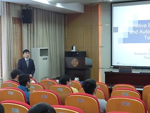 名大巡講(名古屋大学巡講)とは、名古屋大学の協定大学などで開催する名古屋大学教員による大学院授業の模擬講義であり、講義の提供を通じて、協定校との学術交流を深めることが目的です。今回は、名古屋大学大学院工学研究科の曾剛講師、国際言語文化研究科の伊東章子特任講師、そして理学研究科の鈴木孝幸講師が講演を行い、橋本真里国際協力員がJSPS事業説明のため参加しました。